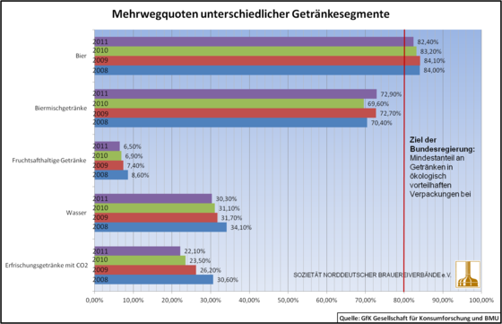 Erfrischungsgetränke wurden in 2010 den Angaben zufolge nur zu 23,5 Prozent (2009: 26,2) in Mehrweg-Packungen verkauft, fruchthaltige Getränke nur zu 6,9 Prozent (2009: 7,4 Prozent). Deutlich höher liegt die Mehrwegquote beim Bier. Hier dominiert die Mehrwegflasche mit 82,4 Prozent im Jahr 2011 (2010 waren es noch 83,2 Prozent, 2009 noch 84,1 Prozent).