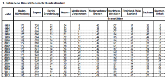 Die vorliegende Statistik bildet die in den Jahren bis 2015 in Deutschland betriebenen Braustätten nach Bundesländern, sowie die jeweilige Gesamtanzahl an Braustätten pro Jahr ab.
